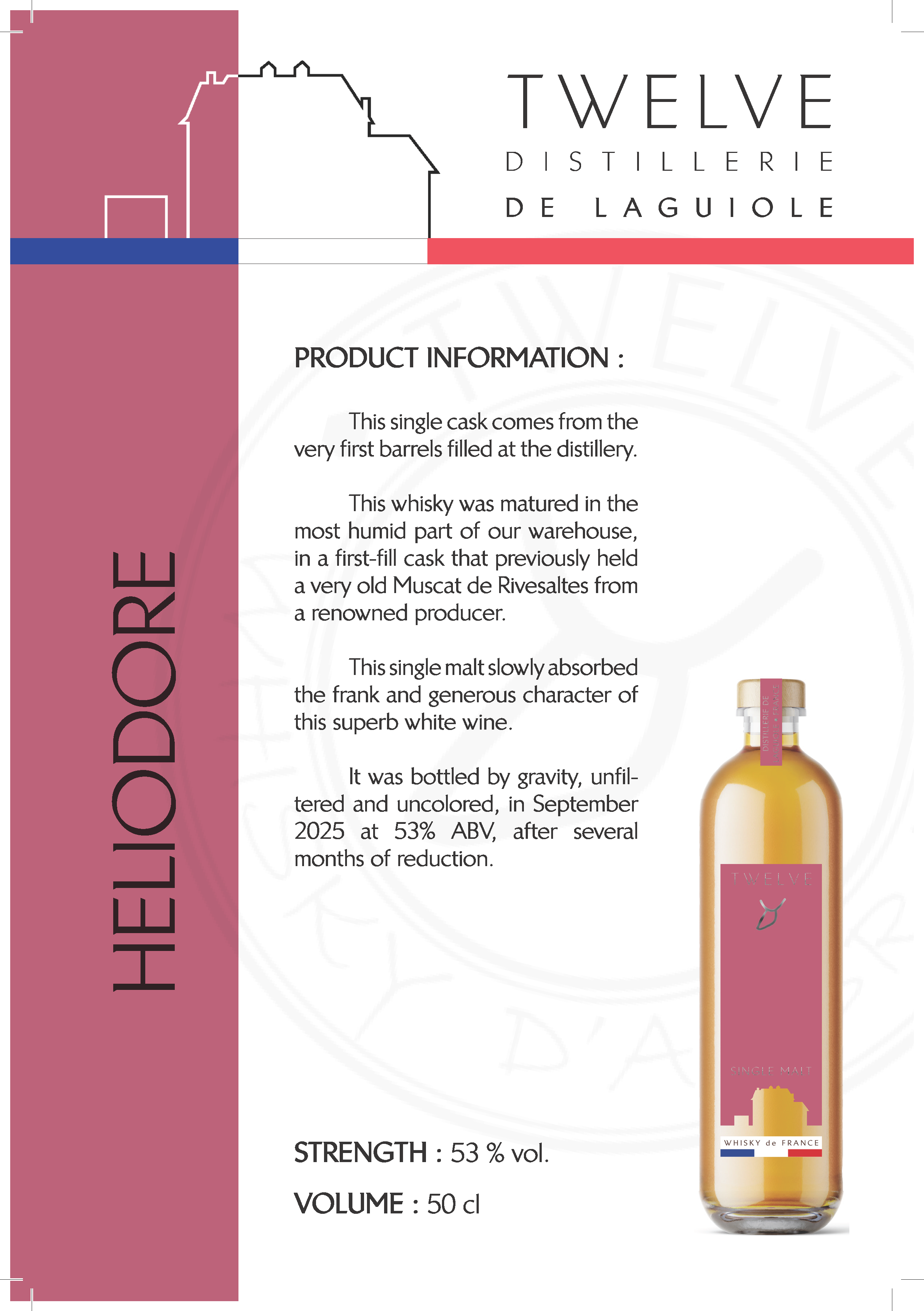This whisky was maturated in the most humid pr of our warehouse, in a first-fill cask that previously held a very old Muscat de Rivesaltes from a renowed producer.
